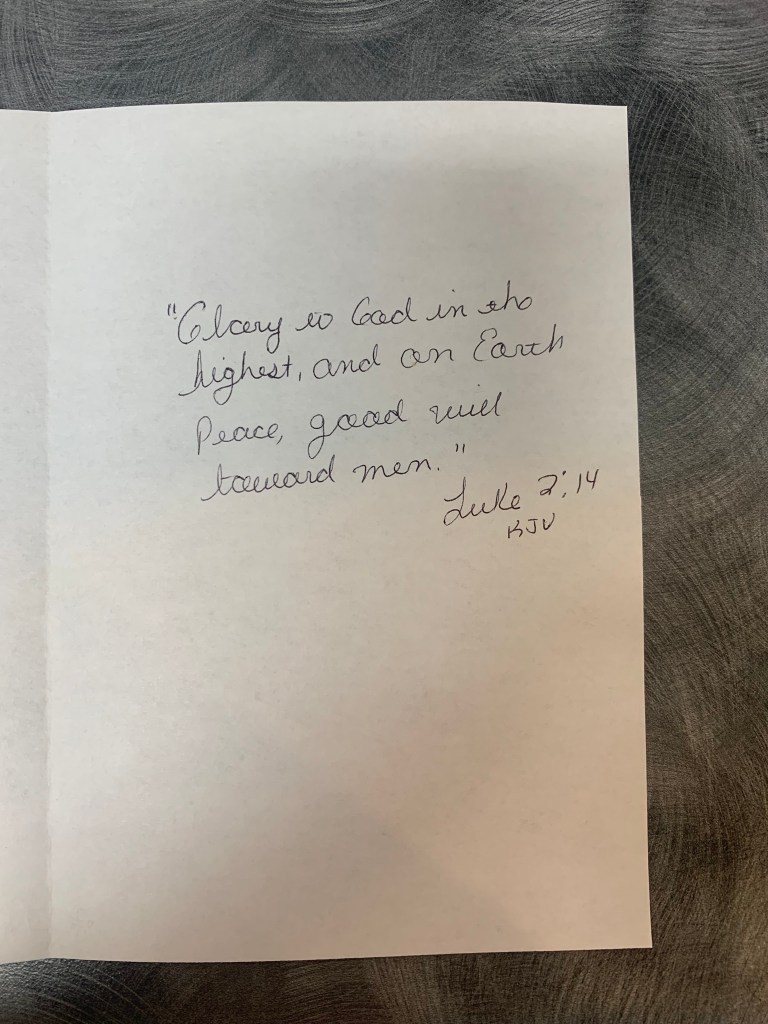 A cousin of mine that moved far away from her KY roots, sent me a Christmas present. Christmas pj’s soft and warm. I sent a thank you card. Then it occurred to me, I don’t have any Christmas cards left. Yes, I could go buy a whole pack for one. It’s not like they will go to waste. I’ll use them next year. Why not make a card?Here’s my very simple card to my cousin.