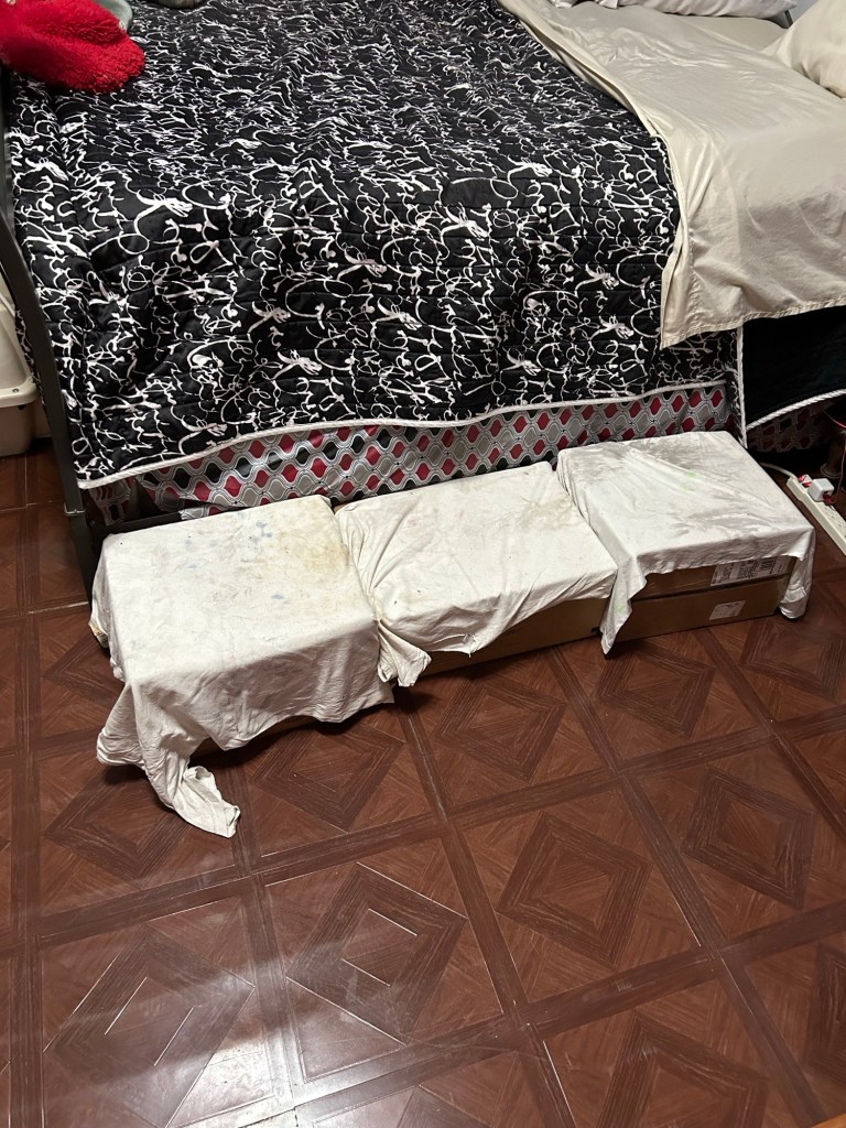 Picked up some boxes from work and placed them on the side of the bed he used. The cardboard was too slick. So, I covered them. He still wouldn’t use them. Plus, there wasn’t enough space for the boxes and me between the bed and the wall. This wasn’t working. I needed Chico to use the new platform at the same time, I didn’t need a broken ankle or a busted nose.
