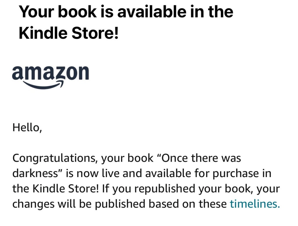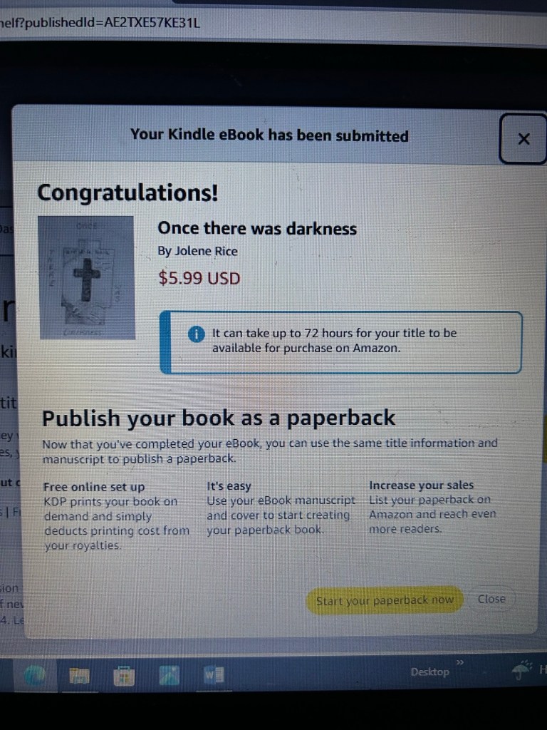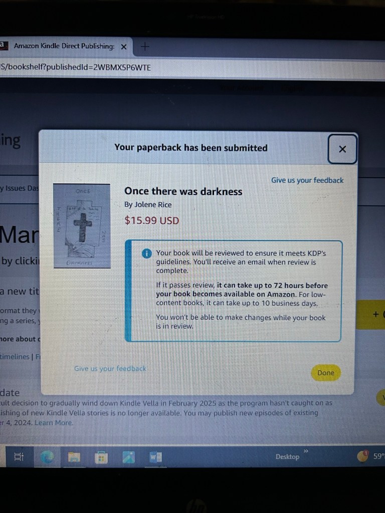 Still working on the paperback. I heard someone say, “once you find what you want to do, everything else gets in the way’. As I continued my journey into writing, I’m finding, this is true. Who has time for housework? Yard work? And the like.