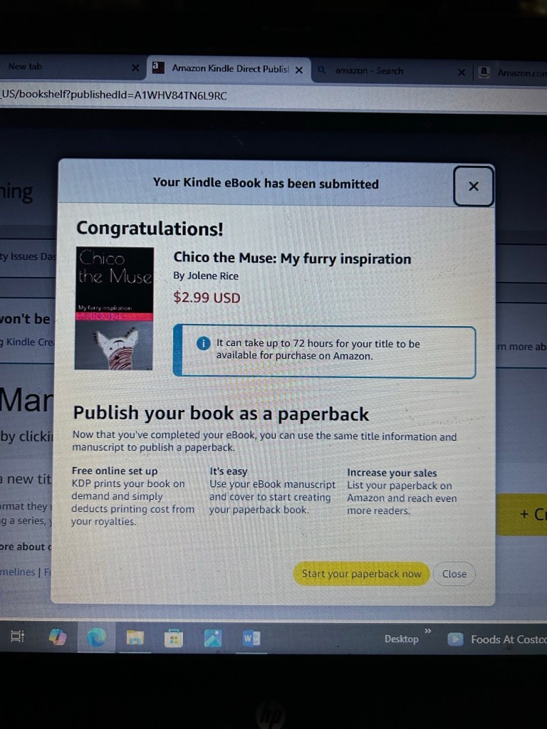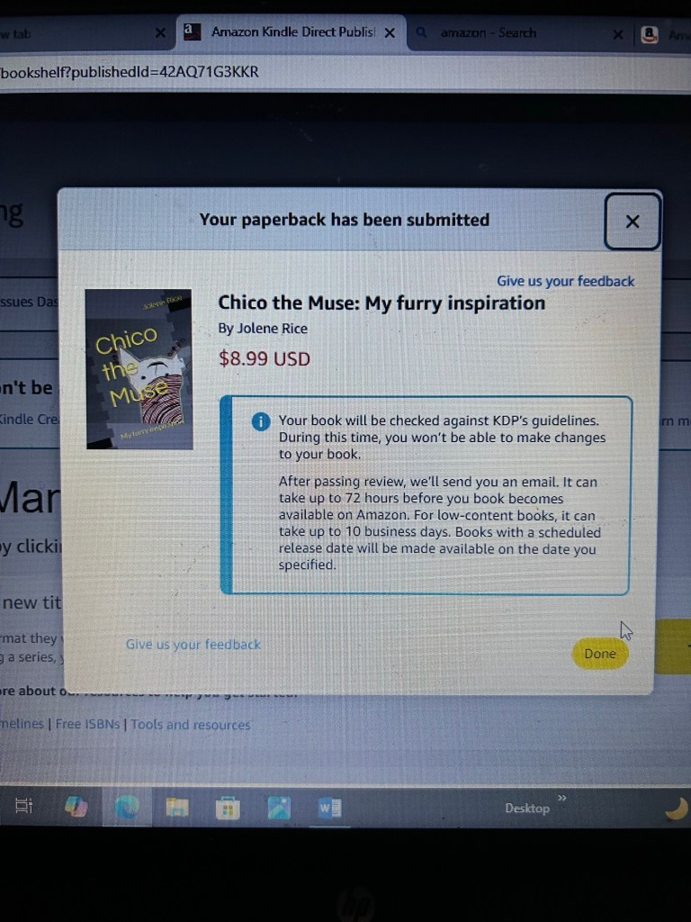 Chico the muse Posted byChico’s MomFebruary 5, 2025Posted inpoetry, UncategorizedTags:book, books, Chico, Chihuahua, poem, poetry My second book of poetry is now on KPD. This one is all about Chico. And, how his has wormed hisself into most of my work. Share this: Click to share on X (Opens in new window) X Click to share on Facebook (Opens in new window) Facebook Like Loading... Published by Chico’s Mom Thanks for visiting. My blog has lots of different styles: drawing, painting, photography, stories and poetry. View more posts