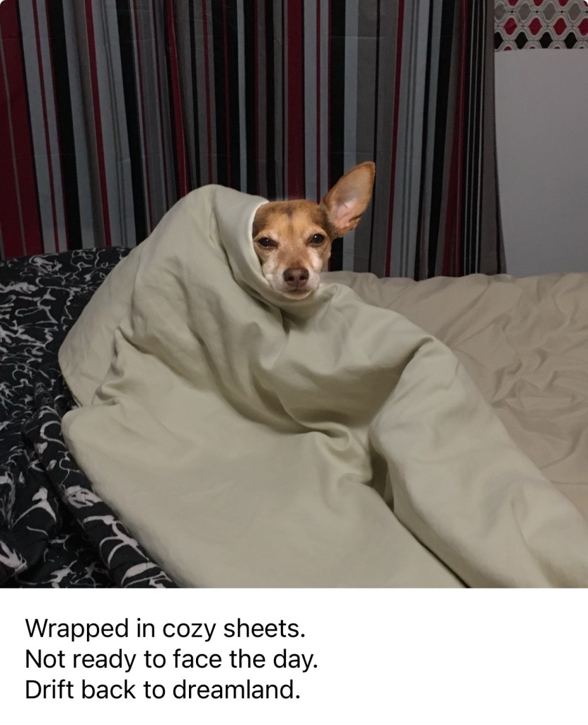 So cute 🐕 Wrapped up like a little burrito, staying warm and avoiding the day