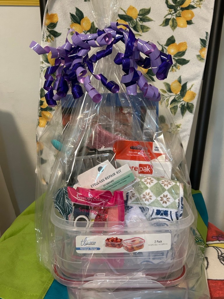 Waste not. Want not., 2 dish towels, sawing kit, 2 cosmetic spatulas, 2 soap bags, travel sized first aid kit, eye glass repair kit, 6 piece set of screw drivers. 2 lock top trustable storage containers.