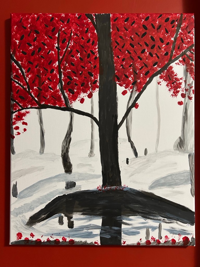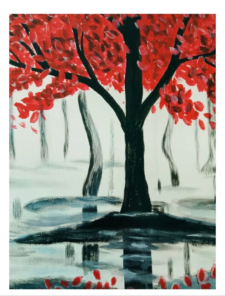 this picture. The more I look at it the more I think, it beautiful, different. I like it. And I want to try to paint it. In the world of art, painting and drawing, I’m a novice. Still learning. So, my painting looking similar but is very different (I think) from the original. I’m still learning how to use this brush. That brush. And the like. Mine.