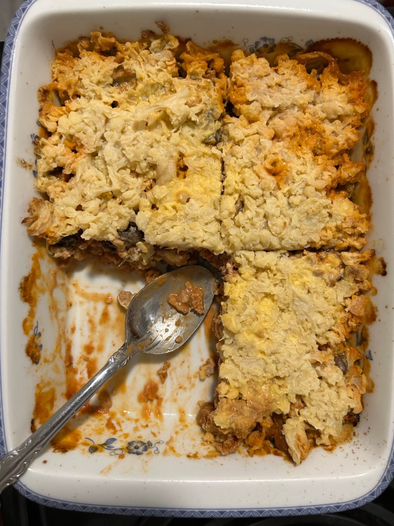 While the meat simmers, finish the topping. Add butter, parmesan and a heavy pinch of salt to cauliflower. Mash with a potato masher until slightly creamy.