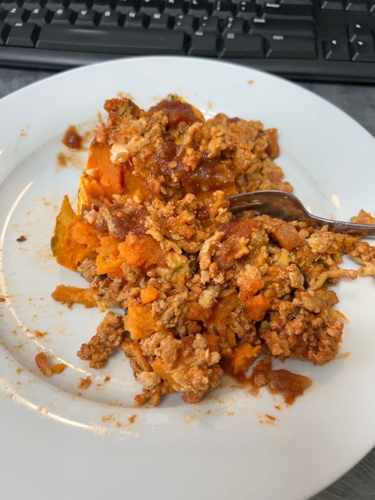 Top the meat with the mashed cauliflower. If using individual baking dishes, split the mashed cauliflower evenly between each Bake for 25 minutes. Allow to cool for 10 minutes before eating.