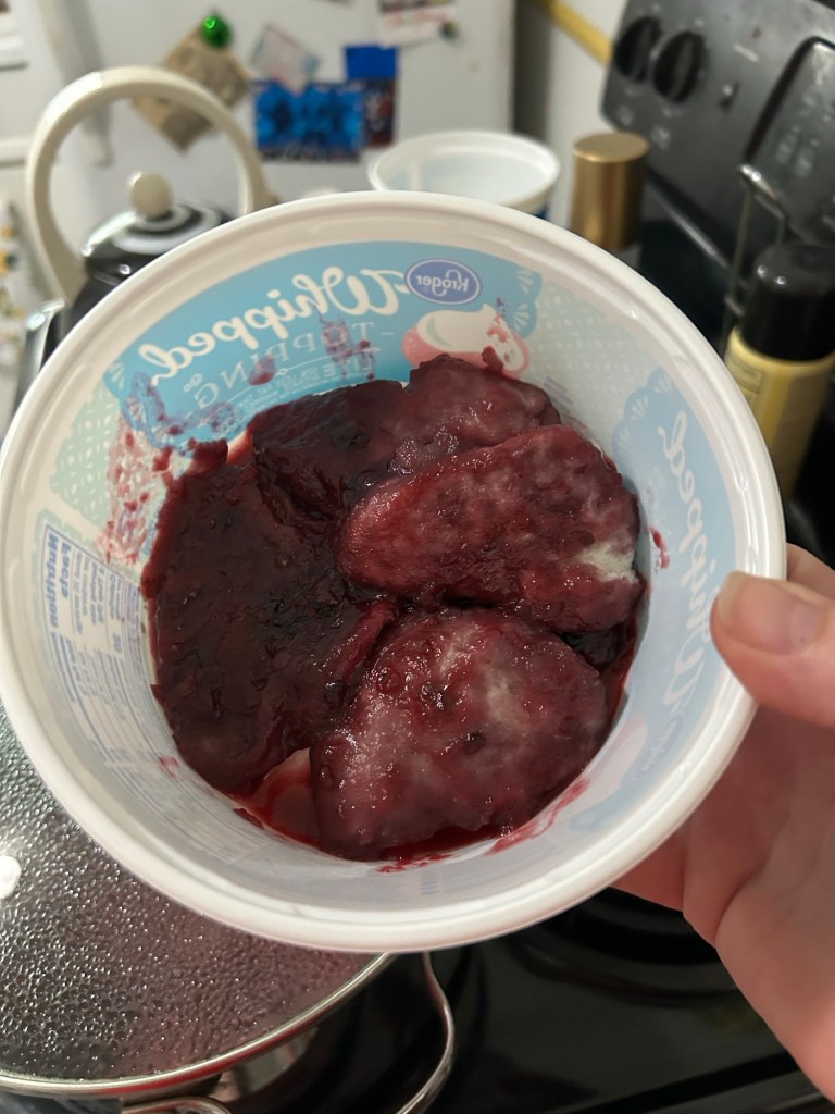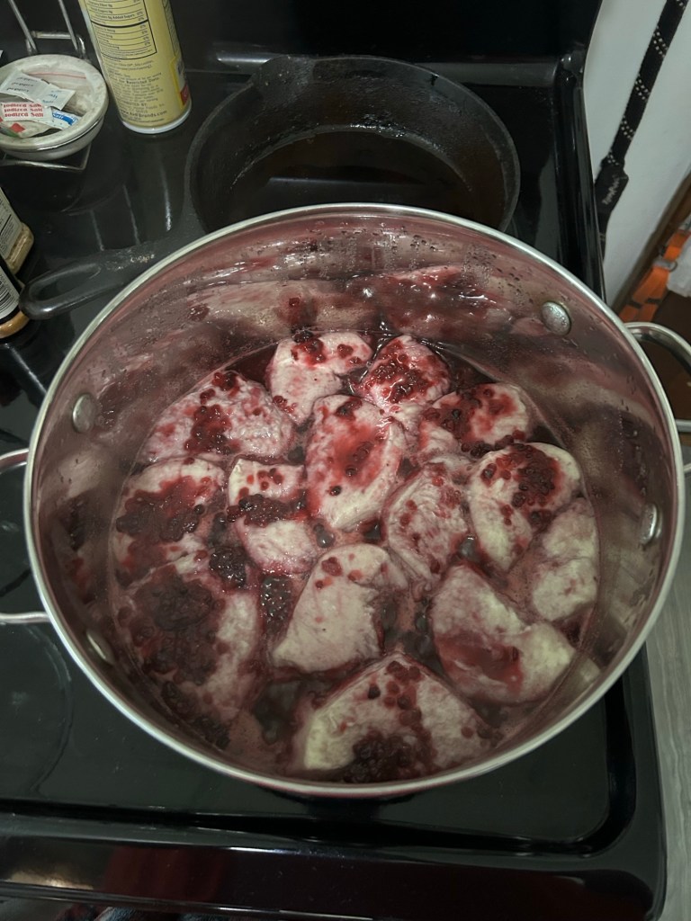 1 quart of blackberries 2 cups of sugar ( I didn’t have 2 cups of sugar. There was only a cup and maybe a 1/4th in the container. So I added a teaspoon of brown sugar. 1 cup of water Splash of lemon juice Bring to a boil, lower to simmer for about an hour The blackberries I bought were about the size of your thumb. I used a potato masher to mash them a little. It helped make for a thicker sauce. * I used canned biscuits for the dumplins. (I know I cheated.) Add the second cup of water, add biscuits boil on medium for 15 minutes. Dumplins were not quite done so I simmered them for another 5 minutes. * Caution they might drive your dog crazy.Enjoy. Cheekie sure did.