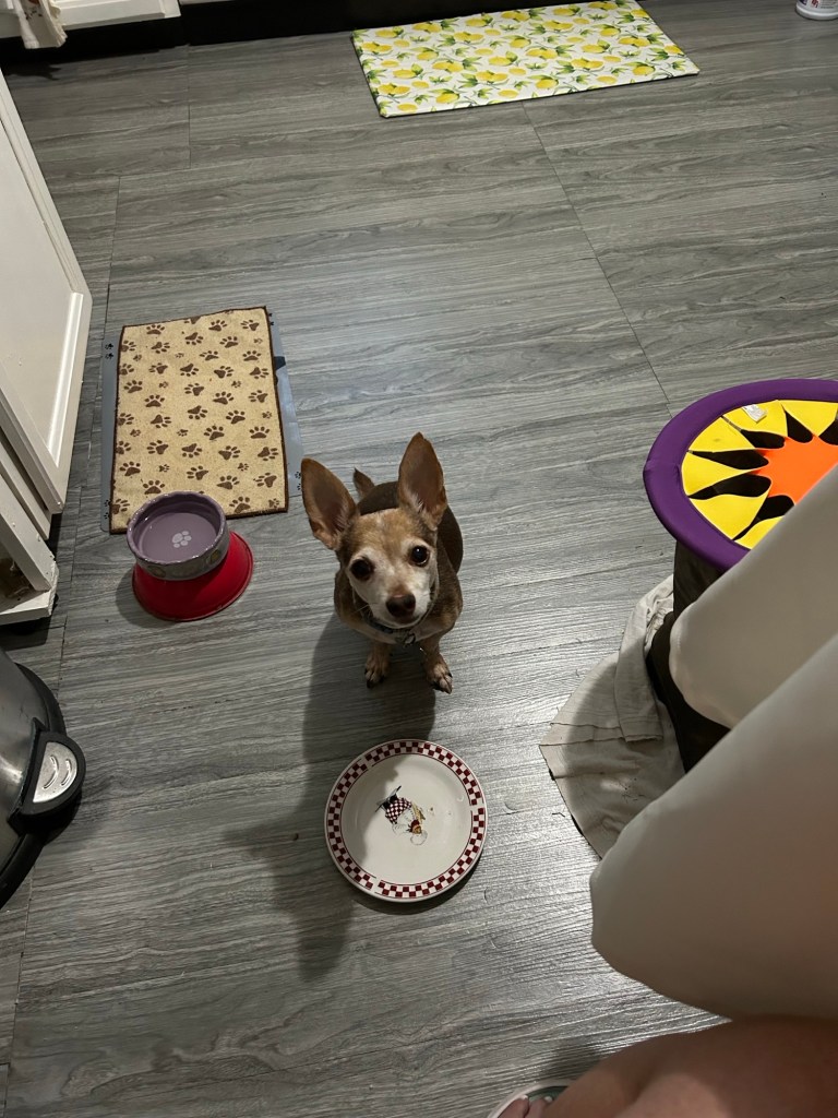 I had to share this. Cheekie has been so cute this morning. In this picture, he’s waiting on my blackberry dumplins. I was a little worried about giving him some but I read they shouldn’t hurt him.