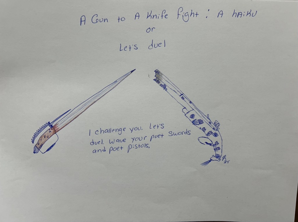 A friend and I have been writing haikus back and forth. We have been following the 5-7-5 format. I wrote this haiku to invite him into a duel. But ended up not sharing it until we were already underway.