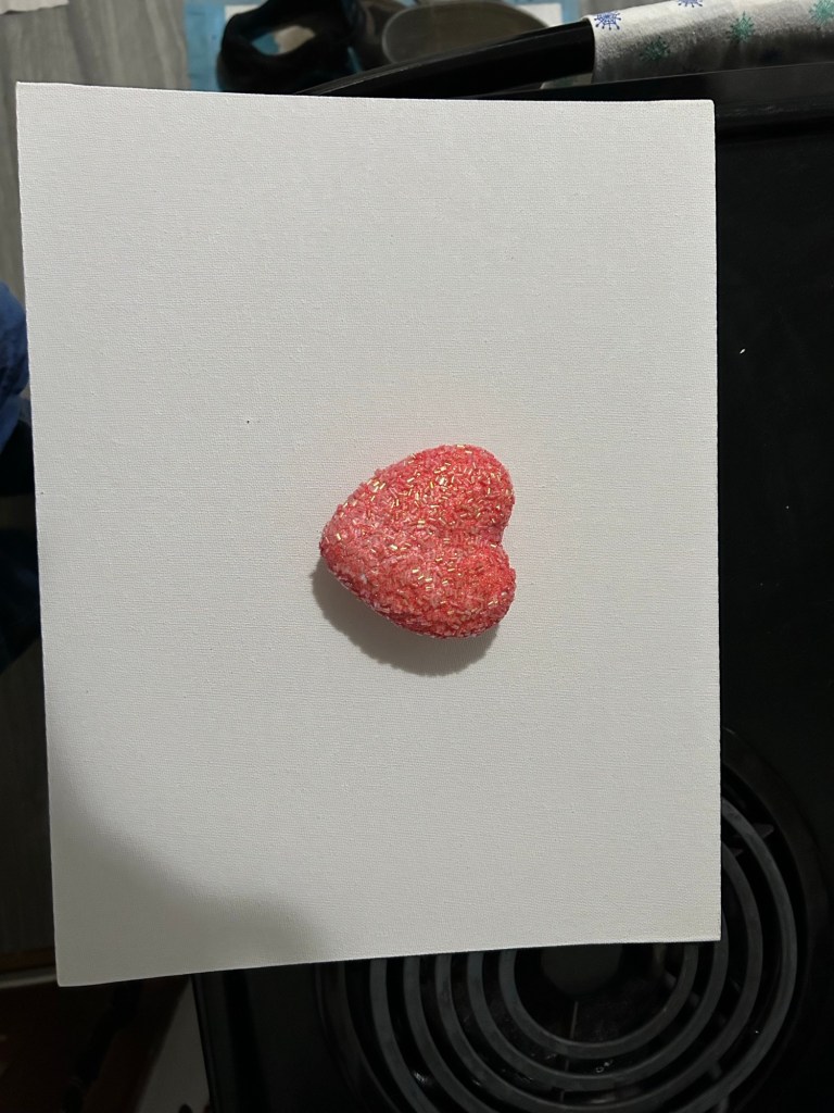My original thought was to paint the heart, in the pictures, white. But each person brings baggage of some kind into a relationship. Be it cultural, parental, spiritual, or personal expectations. Maybe you have trauma. With this, I decided to leave the heart pink and the canvas white. For me, there is no such thing as a clean slate where human emotions are involved.