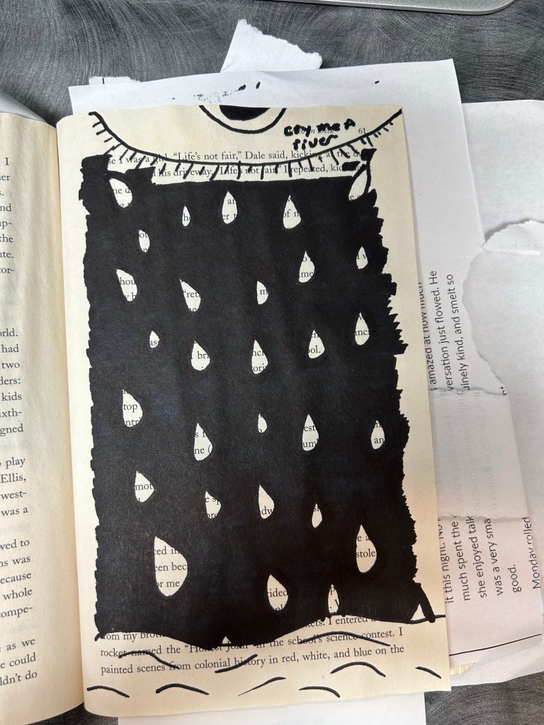 Authors notes: while I had the book open bringing the picture ‘cry me a river’ to life; I used sticky notes to write the words. I’d draw a minute. Write a line. Draw some more. Or color as it were.